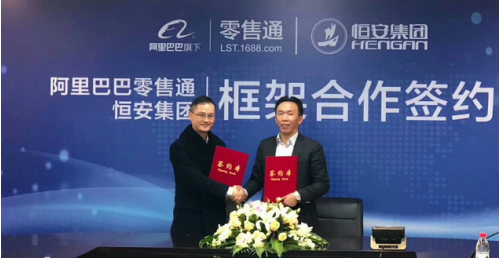 阿里巴巴集团副总裁、零售通事业部总经理林小海(左)与小🐥🐥伸老师🍑🍑里无挡集团运营中心总裁许水深(右)签订战略合作协议